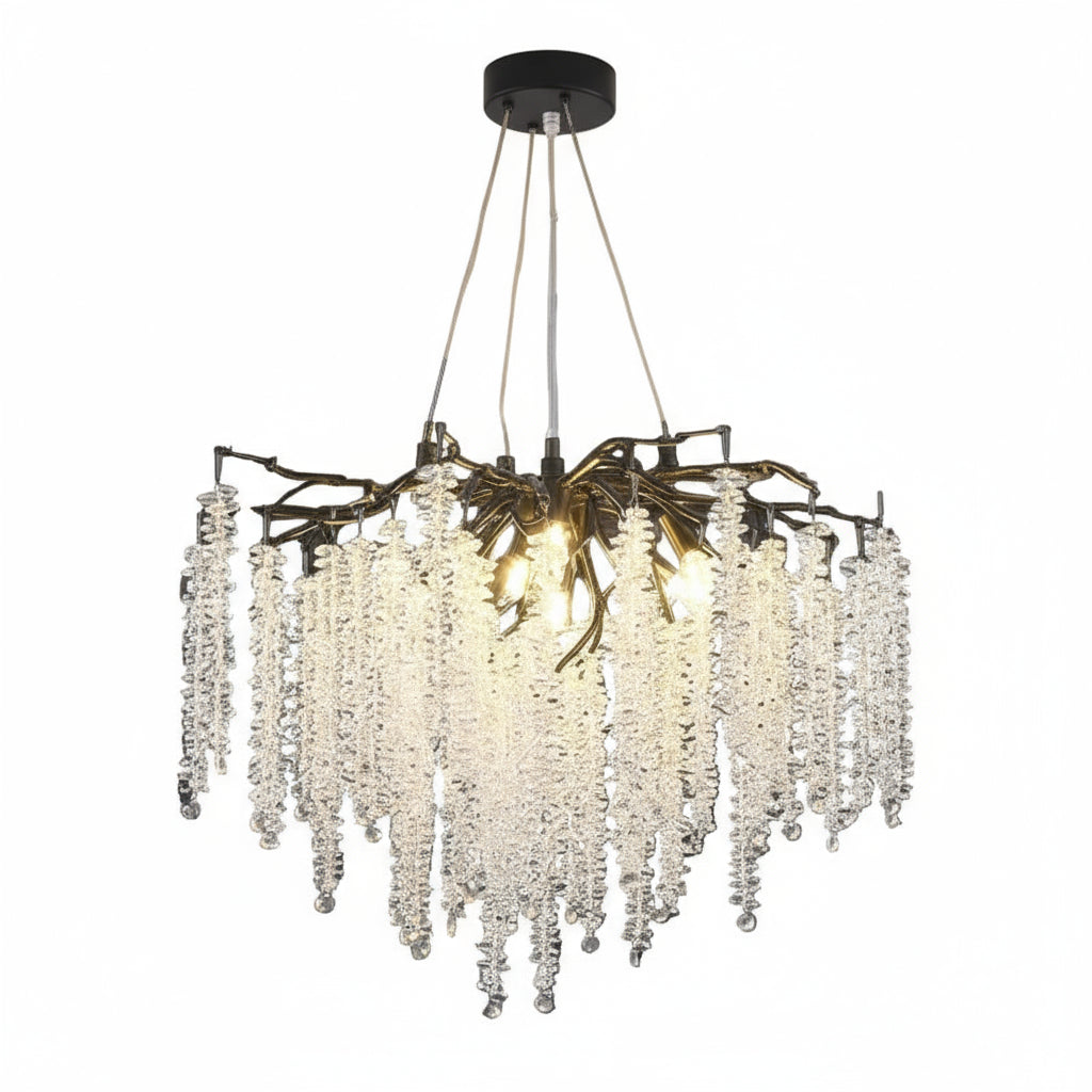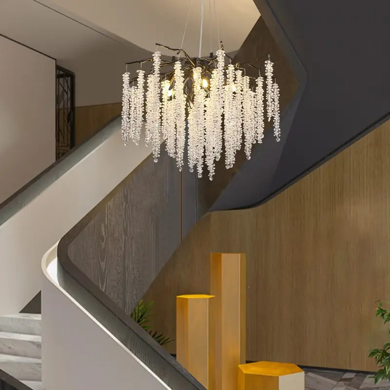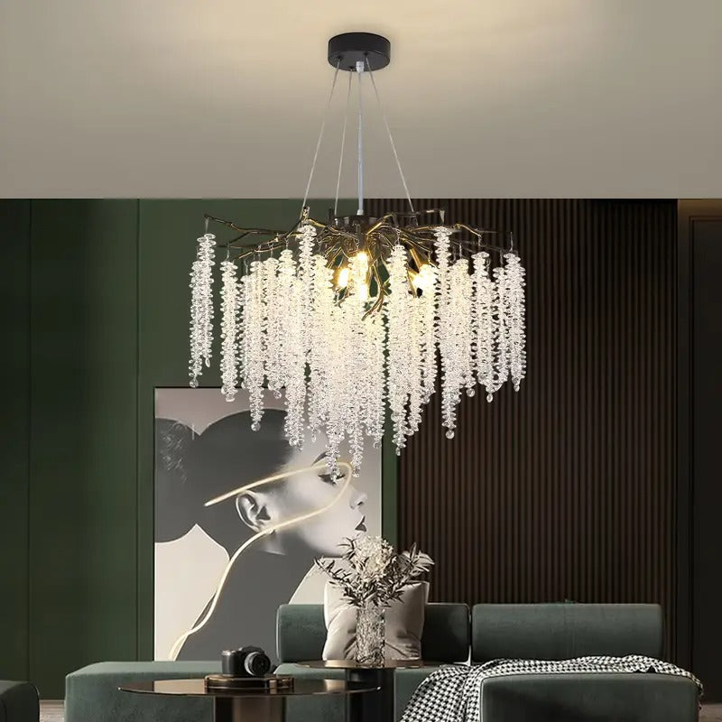 Dieser Kronleuchter ist ein dekoratives Beleuchtungselement, das von der Decke hängt. Er verfügt über einen zentralen Rahmen, der mehreren Ästen ähnelt, von denen jeder mehrere kleine Lichtquellen hält. Zahlreiche Stränge dekorativer Elemente hängen vom Rahmen herab und variieren in der Länge, um eine drapierte Anordnung um die Glühbirnen zu bilden. Der Kronleuchter wird von dünnen Aufhängungsdrähten gehalten, die an einer runden Deckenbefestigung befestigt sind.