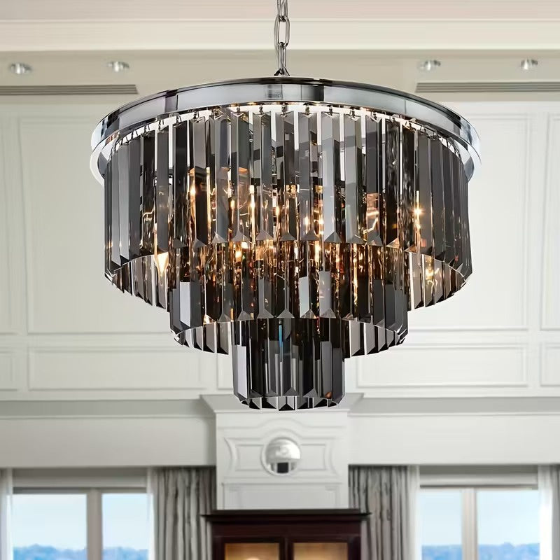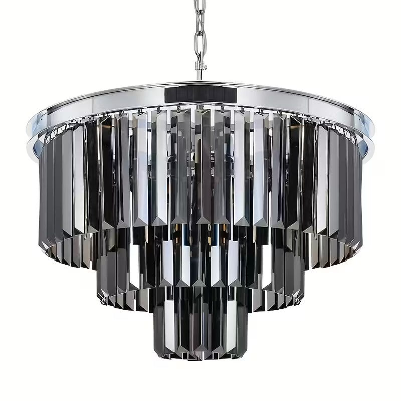 Dieser Kronleuchter hängt über eine Kette von einer Deckenbefestigung. Er verfügt über einen runden Rahmen, der mehrere Reihen vertikaler, rechteckiger, kristallähnlicher Elemente hält. Die Elemente sind in drei Stufen angeordnet und bilden eine Trommelform.