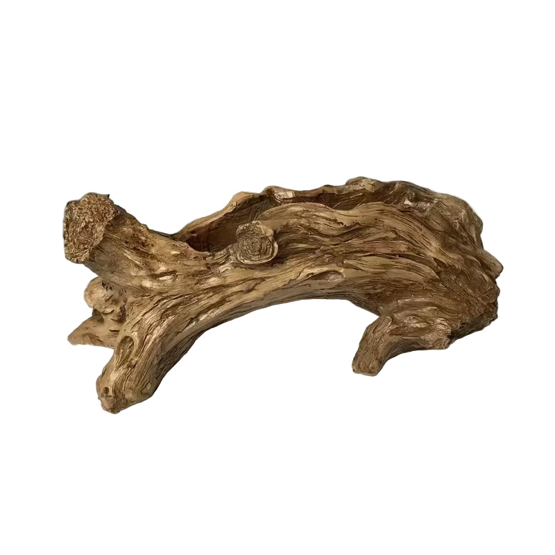 Dieser dekorative Pflanzer ist so geformt, dass er einem Baumstamm ähnelt. Seine Oberfläche hat ein unregelmäßiges, texturiertes Erscheinungsbild mit Rillen und Vertiefungen. Die Oberseite des baumstammähnlichen Pflanzers verfügt über einen langen, eingesenkten Bereich, der zum Halten von Pflanzen geeignet ist.